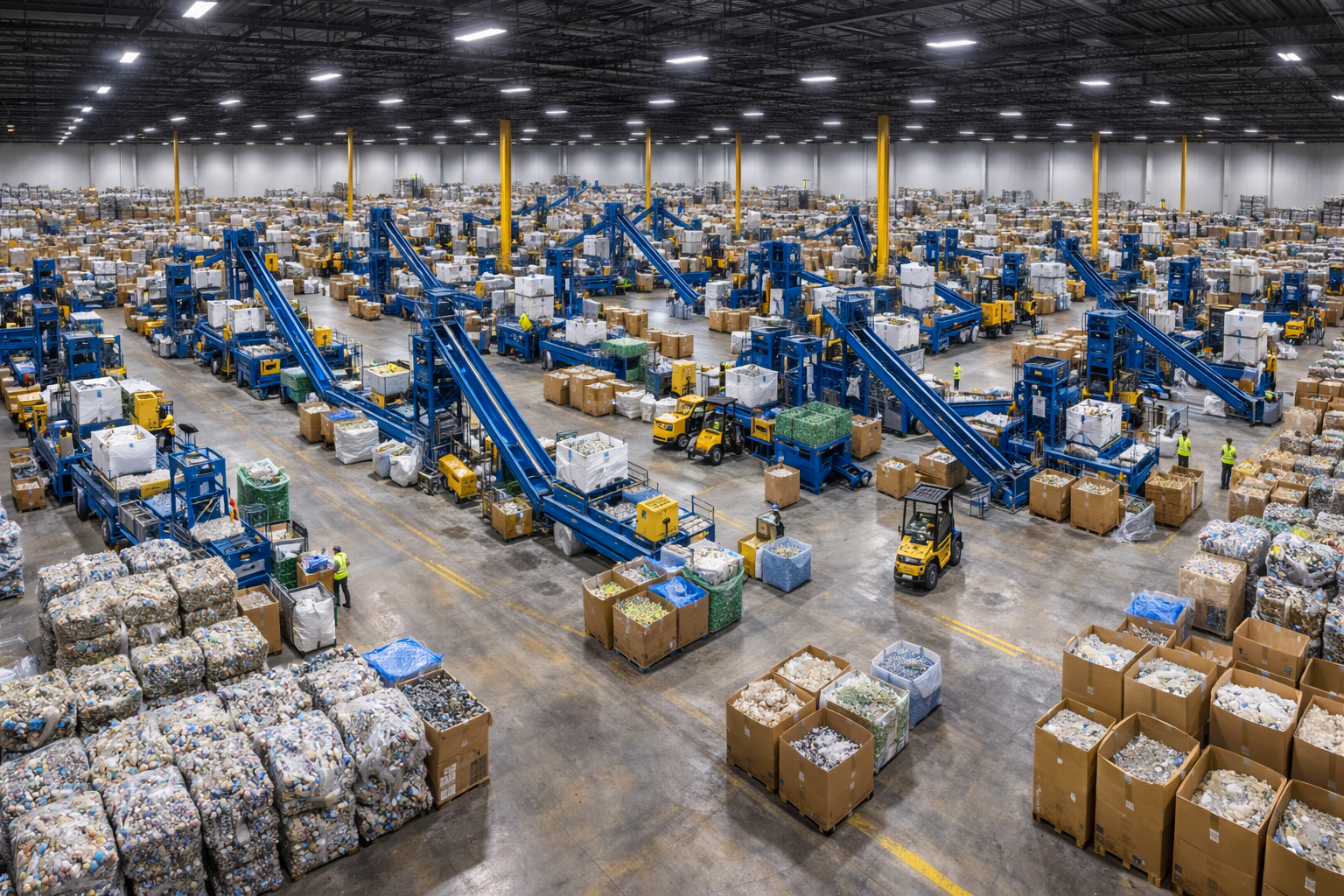Our facility operates 3 large Vecoplan shredders, 3 high-horsepower granulators, 3 float-sink lines, high speed screeners, elutriators, magnetic traps, hand-picking conveyors, and proprietary customized equipment — giving us processing capabilities unmatched in the region.